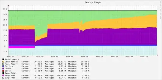 • Look at your graph again. Yes it's reporting 29.69G for used memory - and the graph shows the yellow area peaking at around that value - but between the yellow line and the axis there's a pruple and an blue line - i.e. the 29.69 figure is actually used+buffers+cache. – symcbean Mar 12 '13 at 16:37