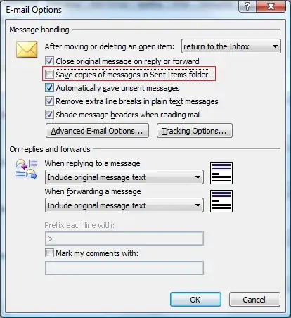 This rule makes copies of outgoing messages so you’ll end up with two copies, one in your Inbox and another in your Sent-Items folder. If you have a small mailbox quota you should prevent Outlook from keeping a copy of outgoing messages in the Sent-Items folder, clear Save copies of messages in Sent Items folder in the dialog below: