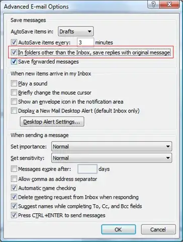 If you have a lot of folders, click In folders other than the Inbox, save replies with original message in the dialog below, to create the same experience in all folders: