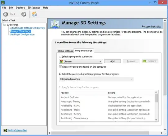At least for me (Driver 445.75, Pascal GPU with Intel Coffee Lake) Chrome never runs on my NVIDIA GPU when using ANGLE even if I set this in NVIDIA Control Panel. Chrome does, however, respect my selection for GPU (either via NCP or right-click context menu) when I choose OpenGL as renderer (as described in the above paragraph).