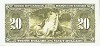 The banknotes retain the "classical elements of the design" of the 1935 Series, and the reverse of most banknote denominations retain the allegorical themes and figures of the 1935 Series.[8] The design of these banknotes has greater uniformity and consistency than the 1935 Series, with the obverse having a framed numeral in the top corners and the written value of each denomination framed in the lower corners, with English on the right and French on the left.[9] The allegorical figures have the same frame in each denomination, unlike the 1935 Series, and are flanked by a large framed numeral representing the denomination's value.[3]