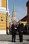 Chinese President Hu Jintao confirmed his attendance at the parade on 3 May. The following day Slovak President Ivan Gašparovič's attendance was confirmed.[7] Other world leaders who confirmed their attendance included Czech President Václav Klaus,[8] French President Nicolas Sarkozy,[8] Italian Prime Minister Silvio Berlusconi,[8] Serbian President Boris Tadić,[9] Bulgarian President Georgi Parvanov,[10] and Vietnamese President Nguyễn Minh Triết,[11] Leaders from Armenia, Azerbaijan, Estonia, Greece, Israel, Kazakhstan, Latvia, Mongolia and Slovenia also confirmed their attendance.[9] On 8 May Sarkozy and Berlusconi announced that they wouldn't be attending the parade in Moscow, so that they could tackle the European sovereign debt crisis.[12][13]