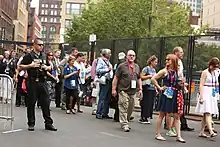 The Cleveland Police Department received $50 million in federal grants to support local police operations during the event.[30] With this grant money, the City of Cleveland sought to purchase over 2,000 riot control personnel gear sets prior to the convention for $20 million, and the remaining $30 million is expected to go to personnel expenses.[31] Items such as water guns, swords, tennis balls and coolers have been banned by the City of Cleveland from the 1.7-square-mile "event zone" outside the convention hall by the City of Cleveland, but because of a statewide open-carry law permitting the open carrying of guns, firearms are permitted.[26][32][33][34] The Cleveland chapter of the NAACP raised concerns in March 2016 in a letter to city and county leaders about security at the convention, writing that police were unprepared for a "possible mix of protesters and demonstrators brandishing guns."[25][35] The Cleveland Police Union also raised concerns similar to those raised by the local NAACP in March, writing that equipment and training for police was behind schedule.[25] On July 16—the eve of the convention—the Cleveland Police Union asked Governor John Kasich to temporarily suspend Ohio's state open-carry gun law so as to block the carrying of guns within the event zone,[26] but Kasich rejected the request, writing: "Ohio governors do not have the power to arbitrarily suspend federal and state constitutional rights or state laws as suggested."[26]