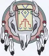 - Description: An Assiniboin Indian tribe ceremonial shield of the grass dance, a ritual of the gods of plenty, in shades of tan, white, black, and green, pendanted with six feathers in shades of gray, red, black, and white; surmounting the shield a buffalo skull, in its proper colors, charged with a parfleche pouch, in its proper colors; the pouch marked with a symbolic design in bright shades of green, red, and blue. Significance: The emblem is symbolic of the squadron and the Assiniboin Indian tribe of Montana, where the squadron was organized in 1953. The three feathers on the left symbolize the character of the squadron personnel: skill, alertness, and pride, while the character of the Strategic Air Command is symbolized by the three feathers on the right: strength, vigilance, and steadfastness. The buffalo skull, used by the Assiniboin Indians in spiritual ceremonies, symbolizes power and plenty. Their parfleche pouch, used to transport meat and pemmican in their travels and to warriors in combat, symbolizes the function of the squadron. Lineage & Honors History.