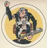 2. Approved 17 May 1945. Description: On a yellow disc, border white, edged black, a caricatured black monkey, affronte, wearing light turquoise blue aviator's helmet, white goggles and parachute straps, and brown parachute pack, having a bandage marked with blood about right forearm holding finger of right hand aloft in "o.k." symbol and grasping with left hand a gray aerial machine gun with smoke issuing from muzzle, all casting a black drop shadow toward base. Maurer reverses the approval dates for the 865th and 866th Bombardment Squadrons.