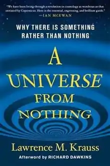 A Universe from Nothing: Why There Is Something Rather than Nothing is a non-fiction book by the physicist Lawrence M. Krauss, initially published on January 10, 2012 by Free Press. It discusses modern cosmogony and its implications for the debate about the existence of God. The main theme of the book is the claim that "we have discovered that all signs suggest a universe that could and plausibly did arise from a deeper nothing—involving the absence of space itself and—which may one day return to nothing via processes that may not only be comprehensible but also processes that do not require any external control or direction."[1][2]