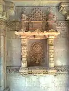 The motifs of flowers and graphics of architecture blend very well with the symbols of Hindu and Jain gods carved at various levels of the well. The dominant carvings on the upper floors are of elephants (3 inches (76 mm) in size, each of a different design). The Islamic architectural style could be attributed to the Muslim king Begda who built it. The walls are carved with women performing daily chores such as churning of buttermilk, adorning themselves, scenes of the performance of dancers and musicians, and the King overlooking all these activities.[3][5][6][13][14]