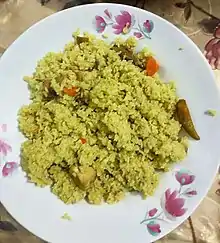 Akhni (Bengali: আখনী) is a mixed rice dish with its origins among the Bengali Muslims of Chittagong and Sylhet,[1] in eastern Bangladesh. It is often considered to be a particular variation of biryani or polao. The dish is especially popular in restaurants throughout Bangladesh,[2] as well as among the diaspora across the world. The dish is a staple in Chittagong, where it is said to be consumed every week by the average Chittagonian person.[3] During Ramadan, the Islamic month of fasting, the dish is popularly eaten at Iftar meals across Sylhet too.[4]