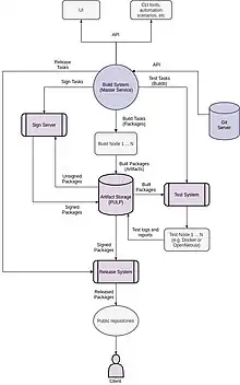 Corresponding with the Master Service, the Build Node's purpose is to perform the compilation of source code stored in the Git repositories to create RPM packages that can later be used as part of the distribution installation process. As artifacts of the build process, these pieces have a dedicated storage from which they can be further processed.
