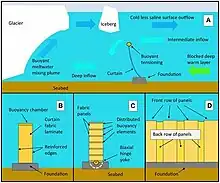 In 2023, a modified proposal was tabled: it was proposed that an installation of underwater "curtains", made out of a flexible material and anchored to Amundsen Sea floor would be able to interrupt warm water flow while reducing costs and increasing their longevity (conservatively estimated at 25 years for curtain elements and up to 100 years for the foundations) relative to more rigid structures. With them in place, Thwaites Ice Shelf and Pine Island Ice Shelf would presumably be able to regrow to a state they last had a century ago, thus stabilizing these glaciers.[19][20][17] To achieve this, the curtains would have to be placed at a depth of around 600 metres (0.37 miles) (to avoid damage from icebergs which would be regularly drifting above) and be 80 km (50 mi) long. The authors acknowledged that while work on this scale would be unprecedented and face many challenges in the Antarctic (including polar night and the currently insufficient numbers of specialized polar ships and underwater vessels), it would also not require any new technology and there is already experience of laying down pipelines at such depths.[19][20]