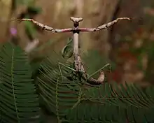 Archimantis latistyla,[1] commonly known as the large brown mantis (also known as the bunny mantis or Australian ghost hopper mantis) is a species of mantid native to Australia. The large brown mantis has two subspecies, a widespread subspecies and the stick mantis ghost from Bundabergs Turtle Sands. The stick mantis ghosts are not as aggressive as the widespread species but have a defense display used to make the mantis appear larger by flinging its front legs into the air and putting its head down along with its antennae. Large brown mantids are light brown with short winged female and a long winged male. The subspecies from Bundaberg is a pale cream white with a yellow and black eye in between the arms (one and a half times the size of the widespread subspecies). The large brown mantis female is short winged - her wings reach only half her abdomen and she is not able to fly— but the long winged male has wings that cover the entire abdomen. They have two pairs of wings - the top pair are the wing covers and the bottom wings enable the mantis to fly.