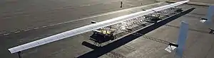 Aurora Flight Sciences announced the Odysseus in November 2018.[1] In spring 2019, Aurora planned to fly a High-Altitude Long Endurance drone powered by solar cells and batteries, Odysseus, to study the Earth atmosphere or as a military pseudo-satellite for intelligence, surveillance and reconnaissance.[2] The 74.1 m (243 ft) wide carbon fibre aircraft should weigh less than a 880 kg (1,940 lb) Smart Car, can carry a 25 kg (55 lb) payload with 250W provided during several months of endurance.[2] It would compete with the Airbus Zephyr ordered by the UK Ministry of Defence and visited by the U.S. Army Futures Command, the BAE Systems-Prismatic Ltd UAV, and the AeroVironment-SoftBank telecommunications UAV.[2] The bendable wing has fiberglass upper skin panels and plastic film undersides, three tails and six propellers, with roll controlled by the outboard tails.[3] It used available, low-risk, lithium polymer batteries and gallium arsenide thin-film solar cells and first test flights were to be powered by batteries only.[3] It was designed to stay day and night above 65,000 ft (20,000 m) up to three months at latitudes up to 20°.[4] First flight was planned for April 2019 in Puerto Rico, before investigating ozone depletion in the summer over the US Midwest. [4] Its first flight was indefinitely delayed by July 2019.[1]