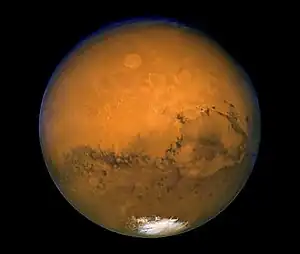 Aurorae Sinus is a dark feature in the southern hemisphere of the planet Mars. Together with albedo features contributed by Aonius Sinus and Solis Lacus, it is part of a feature known as the "eye of Mars". A albedo feature is an area which shows a contrast in brightness or darkness (albedo) with adjacent areas.[1]