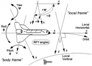 - Finally, in case of space vehicles like the Space Shuttle etc., a modification of the latter convention is used, where the vehicle's (body's) positive y- or pitch axis again always points to its right, and its positive z- or yaw axis always points down, but “down” now may have two different meanings: If a so-called local frame is used as external reference, its positive z-axis points “down” to the center of the Earth as it does in case of the earlier mentioned NED-system,[4] but if the inertial frame is used as reference, its positive z-axis will point now to the north celestial pole, and its positive x-axis to the Vernal Equinox[5] or some other reference meridian.