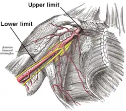 ![]() Axillary artery and its branches—anterior view of right upper limb and thorax. Upper and lower limits labeled. | |