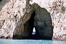 The Azure Window developed through sea erosion of a cliff face. The progress starts with an initial notch resulting from wave action. This space devoid of rock then causes tensile stresses that lead to the formation of a vertical joint extending upwards from the notch. This joint would progressively become wider, first forming a cave and eventually an arch. The end of the lifecycle of the arch is reached when erosion finally progressed so far that the roof of the arch gets heavier than the pillars can support.[1] It is not known exactly when the arch came to being, but the entire process is believed to have taken around 500 years.[2][3]