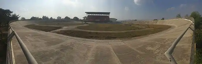 The 333.33 m or 1,093.6 ft velodrome is outdoor and the surface is made of concrete. While it was a prime venue for the 3rd Nationals Games in the year 1993–94 it has never been a place for any major events thereafter, and was left unused. In 2014 it was announced that with a Rs 10 crore maintenance grant from the governments for the entire complex, the facelift of the velodrome had top priority. At that time the velodrome was in dilapidated state.[15]