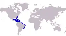 The bar jack is widely distributed throughout the tropical and subtropical waters of the western Atlantic Ocean, and is a common species throughout most of its range.[8] The northernmost limit of its range is New Jersey in the northern United States, with its range extending south along the continental coast to Venezuela. It inhabits a number of offshore islands and archipelagos including Bermuda, as well as the West Indies.[10] The bar jack is most abundant in the Gulf of Mexico, the West Indies and Caribbean, but in the Gulf of Mexico is limited to offshore waters. There have been reliable reports of the species from Rio de Janeiro in Brazil and far offshore at Saint Helena in the south central Atlantic,[16] which would extend the species southern limit significantly if correct.[8]