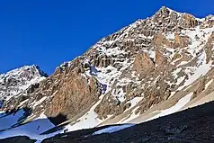 The southern mountains offer excellent, but very difficult climbing with many sheer rock faces. Summits are Pyramid Peak [5,509 meters (18,074 ft)] and Pik Skalistiy [5,621 meters (18,442 ft)].