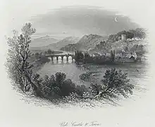 Pwll Melyn . . . is the pond lying north-east of Usk Castle. . . numerous skeletons were found in this pond when it was cleaned out. The pond is so called because the water is always slimy and of a dirty colour. . . The 'pwll' itself is reduced in size, the marshy land drained, and the 'pwll' is now enclosed by an iron railing and supplies water to the railway. From the 'pwll' the ground rises westward and here Owen's army attacked the castle on the north. It is a well-known spot and the name has never been lost.