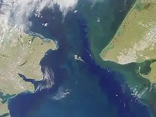 The Bering Strait is about 82 kilometers (51 mi) wide at its narrowest point, between Cape Dezhnev, Chukchi Peninsula, Russia, the easternmost point (169° 39' W) of the Asian continent and Cape Prince of Wales, Alaska, United States, the westernmost point (168° 05' W) of the North American continent. Its deepest point is only 90 m (300 ft) in depth. It borders the Chukchi Sea (part of the Arctic Ocean) to the north and the Bering Sea to the south.[2][3] The strait is a unique habitat sparsely populated by the Yupik, Inuit, and Chukchi people who have cultural and linguistic ties to each other.[4]