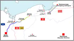 With the end of the Cold War, and particularly with Poland joining the European Union, increasing thought has been given to reconstructing the road as part of the European highway system. In the 1990s, a 14 kilometre (8.7 mile) long segment near the western Polish border was incorporated into the new A6 Autostrada (highway). A further 7 kilometres (4.3 miles), to the junction with National Road 10, was being restored and was scheduled to open for traffic in August 2007. An additional 8 kilometres (5.0 miles) is to be upgraded at some future date and redesignated as part of the A6. The section between Elbląg and the border with Russia was completely reconstructed and opened as an express road, S22, in September 2008. In the course of the upgrade, the new modern carriageway was built in the space left for the second carriageway during original construction. At the same time, the original concrete carriageway was demolished almost along the entire length of the route, and only a few traces of it remain. All of the remaining original overpasses and bridges were demolished and replaced with modern works. Thus very few traces of the original German autobahn can be seen. Other part of the Berlinka are incorporated into voivodeship road 142, and expressroad 6/3. In the Russian Kaliningrad Oblast, it is incorporated into road P516.