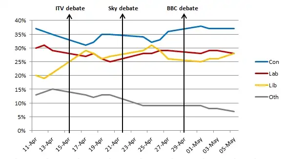 | Highlights In the third and final poll, David Cameron was widely regarded as the party leader who made the best impression to the audience at home.[75][76][77][78][79] At the end of the debating night, the Conservatives had gained a 5% lead over Labour. | ||||