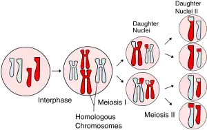 The cell cycle is a series of events that take place in a cell that cause it to divide into two daughter cells. These events include the duplication of its DNA and some of its organelles, and the subsequent partitioning of its cytoplasm into two daughter cells in a process called cell division.[56] In eukaryotes (i.e., animal, plant, fungal, and protist cells), there are two distinct types of cell division: mitosis and meiosis.[57] Mitosis is part of the cell cycle, in which replicated chromosomes are separated into two new nuclei. Cell division gives rise to genetically identical cells in which the total number of chromosomes is maintained. In general, mitosis (division of the nucleus) is preceded by the S stage of interphase (during which the DNA is replicated) and is often followed by telophase and cytokinesis; which divides the cytoplasm, organelles and cell membrane of one cell into two new cells containing roughly equal shares of these cellular components. The different stages of mitosis all together define the mitotic phase of an animal cell cycle—the division of the mother cell into two genetically identical daughter cells.[58] The cell cycle is a vital process by which a single-celled fertilized egg develops into a mature organism, as well as the process by which hair, skin, blood cells, and some internal organs are renewed. After cell division, each of the daughter cells begin the interphase of a new cycle. In contrast to mitosis, meiosis results in four haploid daughter cells by undergoing one round of DNA replication followed by two divisions.[59] Homologous chromosomes are separated in the first division (meiosis I), and sister chromatids are separated in the second division (meiosis II). Both of these cell division cycles are used in the process of sexual reproduction at some point in their life cycle. Both are believed to be present in the last eukaryotic common ancestor.