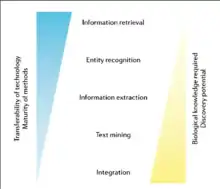 Information extraction, or IE, is the process of automatically identifying structured information from unstructured or partially structured text. IE processes can involve several or all of the above activities, including named entity recognition, relationship discovery, and document classification, with the overall goal of translating text to a more structured form, such as the contents of a template or knowledge base. In the biomedical domain, IE is used to generate links between concepts described in text, such as gene A inhibits gene B and gene C is involved in disease G.[35] Biomedical knowledge bases containing this type of information are generally products of extensive manual curation, so replacement of manual efforts with automated methods remains a compelling area of research.[36][37]