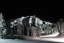 At mid-mountain, a second day lodge (Pioneer Lodge - 1973) sits at 6,800 feet (2,070 m) with a sizable parking lot, a cluster of condominia (1975),[4] and the Jason Harper Training Center. From this Pioneer area, there is direct access to the gentle south-facing slopes served by a high speed quad chairlift, Morning Star (#2) and the north-facing slopes of the Bitterroot (#5), a double chair lift (vertical: 525 ft (160 m)), which runs only on weekends and holidays. In addition, there is connecting trail access to the base of the Superior Express (#3) lift. With its 1,500-foot (457 m) vertical rise, the Superior Express serves the advanced and expert terrain on the northern face of Shafer Butte, unloading at 7,480 feet (2,280 m). It replaced a Riblet double chairlift built in 1965,[12][13] and cut the ride time of the original lift in half.[14] Night skiing was added to the Superior area with the installation of lights in the summer of 1986, and Morning Star was converted from a double to a triple chairlift in 1999.