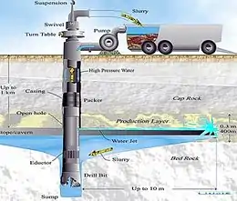 The tool is lowered into a well until the hydromonitor reaches the required depth. Then the high-pressure water is pumped down. Approximately one-half of it leaves the tool through the hydromonitor and is expelled outside the tool in a form of a powerful waterjet. The jet cuts and loosens ore producing a slurry which is pumped back to the surface by the Eductor. In a collecting pond or tank, the slurry is separated and clarified water is re-circulated. While extracting rocks and ores, different-shaped caverns can be created. Their shape depends on the BHM tool manipulation while mining which obviously consist of the tool rotation, sliding it up and down and combination of these two. Borehole mining is applied from vertical, horizontal and deviated wells.