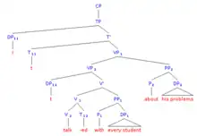 If a pronoun has a quantified expression as antecedent, the pronoun must be c-commanded by this antecedent.[3][4] An antecedent c-commands a pronoun if, when observing the structure of the sentence, a sister of the antecedent dominates the pronoun.[5]