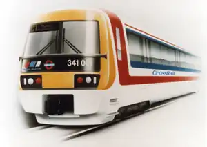 Class 341 was intended as the rolling stock for the Crossrail project, and would have entered service in the late 1990s. A mock-up unit demonstrating the design of the train (and moquette) was built in 1991.[2] At one point, the Class 341 would form part of the Networker family of trains as 'Networker Crossrail'.[1] The Crossrail project was rejected by Parliament in 1994,[3] and the train was not ordered.