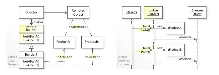 The UML sequence diagram shows the run-time interactions: The Director object calls buildPartA() on the Builder1 object, which creates and assembles the ProductA1 object. Thereafter, the Director calls buildPartB() on Builder1, which creates and assembles the ProductB1 object.