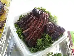 Burnt ends are flavorful pieces of meat cut from the "point" half of a smoked brisket.[1] When brisket muscles are separated, the lean "first cut" or "flat cut" is the deep pectoral, while the fattier "point", also known as the "second cut", "fat end", or "triangular cut", is the superficial pectoral. A traditional part of Kansas City-style barbecue, burnt ends are considered a delicacy in barbecue cooking. Either the entire brisket is cooked whole, then the point end is removed and cooked further, or the point and flat are separated prior to cooking. Due to the higher fat content of the brisket point, it takes longer to fully cook to tender and render out fat and collagen. This longer cooking gave rise to the name "burnt ends". Sometimes when the flat is done, the point is returned to the smoker for further cooking. Some cooks re-season the point at this time.