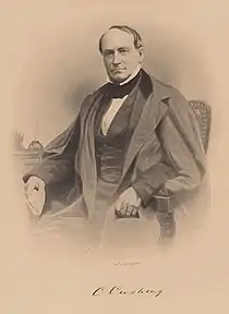 On January 9, 1874, Grant nominated Cushing as Chief Justice of the United States Supreme Court. The nomination came soon after Grant withdrew the nomination of George Henry Williams to the position.[9] The selection caught many off-guard, including Cushing himself.[10] Radical Republicans in the U.S. Senate immediately challenged Cushing's loyalties on account of his earlier close personal rapport with Andrew Johnson and his alleged pre-Civil War Copperhead sympathies. Their feelings of distrust turned into all out opposition to his confirmation when a (non-political) letter that Cushing had written in 1861 to President of the Confederacy Jefferson Davis was found and made public. As a result of rising furor, the nomination was withdrawn on January 13, 1874.[11][12]