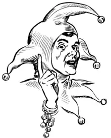 The cap 'n' bells is a type of fool's cap with bells worn by a court fool or jester.[1] The bells were also added to the dangling sleeves and announced the appearance of the jester.[2][3]