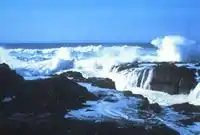 Along the Cape Perpetua coastline, there are several unique features as well. The Devils Churn is a long crack in the coastal rock that fills with each ocean wave, occasionally exploding as incoming and outgoing waves collide. The Spouting Horn at Cook's Chasm and Thor's Well on the plateau nearby are both salt water fountains driven by the power of the ocean tide.[11] Thor's Well is at 44.278421°N 124.113499°W. Spouting Horn is at 44.277497°N 124.112994°W. Both Thor's Well and Spouting Horn are best seen approximately an hour before high tide to an hour after high tide. How spectacular the sights are is a function of the height of the high tide and the direction and size of the swells. The wind can also be a factor. Devil's Churn, Spouting Horn and Thor's Well are popular with visitors; however, all three can be dangerous, especially at high tide and during winter storms.[1]