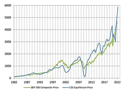 The CSS equilibrium condition suggests that the Fed model might be misspecified: the S&P 500 earnings yield during 1987 to 2000 was not in equilibrium with the government bond yield but with the average after-tax interest rate on corporate bonds. The CSS theory suggests that the Fed equilibrium was only observable after 1982, the year in which the United States Securities and Exchange Commission allowed open-market repurchases of shares.[7] However, the CSS theory cannot explain why the Fed model relationship breaks down for all other periods, such as 2000 to 2019.