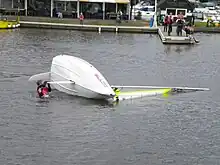 Righting a capsized Laser sailing dinghy by standing on the daggerboard