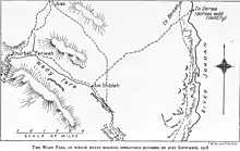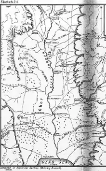 Chaytor's Force held the right flank from their junction with the XX Corps in the Judean Hills 8 miles (13 km) north west of Jericho, across the Jordan Valley, and then southwards through the Ghoraniye and Auja bridgeheads to the Dead Sea.[8] This area garrisoned by Chaytor's Force was overlooked by well sighted Ottoman long range guns.[9]