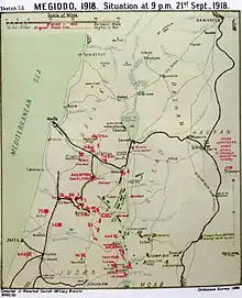 By early afternoon of 21 September, organised Yildirim Army Group resistance in the Judean Hills had ceased, most of the Ottoman Eighth Army had surrendered while the Seventh Army was retreating east down the Wadi el Fara road hoping to cross the Jordan River by the bridge at Jisr ed Damieh.[12][13]