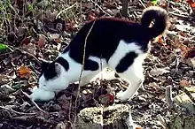 Object play for cats is the use of inanimate objects by the animal to express play behaviour.[3] In the case of pet domestic cats, humans normally provide them with purchased, human-made toys such as toy mice, bird or feather toys, or toy insects. These may be suspended from a string attached to a wooden or fishing-style rod designed to simulate lifelike activity in the toy, triggering the cat's predatory insticts – this game is known as catfishing.[4] Cat play can be enriched with the addition of obstacles behind which the prey can hide and items that make sound when the toy moves through them such as dried leaves, grass, or even a paper bag. When it comes to non-domestic, wild cats, they may use several objects in the wilderness as their toys including sticks, leaves, rocks, feathers, etc. Play behaviour includes throwing, chasing, biting, and capturing the toy object, mimicking behaviors used during an interaction with a real source of prey. Engaging in object play helps young cats practice these adult skills.[3]