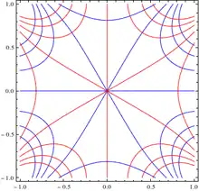 Contour plot of a pair u and v satisfying the Cauchy–Riemann equations. Streamlines (v = const, red) are perpendicular to equipotentials (u = const, blue). The point (0,0) is a stationary point of the potential flow, with six streamlines meeting, and six equipotentials also meeting and bisecting the angles formed by the streamlines.