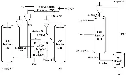 2O with very little diluent nitrogen. The air reactor flue gas can be discharged to the atmosphere causing minimal CO2 pollution. The reducer exit gas contains almost all of the CO2 generated by the system and CLC therefore can be said to exhibit 'inherent carbon capture', as water vapor can easily be removed from the second flue gas via condensation, leading to a stream of almost pure CO2. This gives CLC clear benefits when compared with competing carbon capture technologies, as the latter generally involve a significant energy penalty associated with either post combustion scrubbing systems or the work input required for air separation plants. This has led to CLC being proposed as an energy efficient carbon capture technology,[9][10] able to capture nearly all of the CO2, for example, from a Coal Direct Chemical Looping (CDCL) plant.[11][12] A continuous 200-hour demonstration results of a 25 kWth CDCL sub-pilot unit indicated nearly 100% coal conversion to CO2 with no carbon carryover to the air reactor.[13][14]