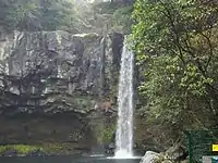 Cheonjiyeon Waterfall is a waterfall on Jeju Island, South Korea.[1] Literally, the name Cheonjiyeon means sky (Ch'eon) connected with land (ji).[1] It is one of the main tourist attractions on Jeju-do.[2][3] It is 22 m (72 ft) high and 12 m (39 ft) wide.[4][5] Though water always falls in one particular area, depending on the amount of recent rain, the water may spread out.[2] At the bottom of the waterfall is an artificial pond that is 20 m (66 ft) deep.[5] Two small dams help keep the water at a specific level.[2] Large volcanic rocks form landbridges that allow tourists to pose for photographs in front of the falls.[6] These falls are characterized by its trachyte andesite rocks.[7] The source of Cheonjiyeon Waterfall is a spring that comes out of the floor of the Somban Stream.[8] The stream Yeonhee-chun is the source of the waterfall.[9] The waterfall is one of the three famous waterfalls of Jeju, the other two being Cheonjeyeon Waterfall and Jeongbang Waterfall.[2]
