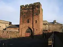 Prominent people held as prisoners in the crypt of the Agricola Tower were Richard II and Eleanor Cobham, wife of Humphrey, Duke of Gloucester, and Andrew de Moray, hero of the Battle of Stirling Bridge.[4] During the Wars of the Roses, Yorkist John Neville, 1st Marquess of Montagu was captured and imprisoned at the castle by Lancastrians following the Battle of Blore Heath, near the town of Market Drayton, Shropshire, in 1459. He was released from captivity following the Yorkist victory at Northampton in 1460.[5] Outside the outer bailey gate was an area known as the Gloverstone where criminals waiting for execution were handed over to the city authorities. The Great Hall was rebuilt in the late 1570s.[1]