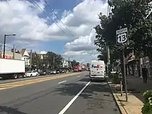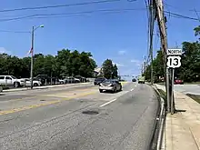 When the Sproul Road Bill was passed in 1911, the road between Chester and Philadelphia was legislated as part of Legislative Route 180 and as Legislative Route 150 between Philadelphia and Morrisville.[16] With the creation of the U.S. Numbered Highway System in 1926, US 13 was designated through Pennsylvania from the Delaware border in Marcus Hook northeast to US 1/PA 1 at Bridge Street in Morrisville.[17] The route followed Post Road between Marcus Hook and Chester, Chester Pike between Chester and Darby, and Main Street through Darby before it reached Philadelphia. This route effectively replaced part of the Capitol Trail, an auto trail connecting Philadelphia and Atlanta via Washington DC.[18][19] US 13 passed through Philadelphia along Woodland Avenue, Market Street, Broad Street, Diamond Street, Front Street, Kensington Avenue, and Frankford Avenue. The route continued into Bucks County and followed Bristol Pike to Morrisville, where it headed north on Philadelphia Avenue and Pennsylvania Avenue to US 1. In Philadelphia, US 13 ran concurrent with US 1 on Woodland Avenue north of Baltimore Avenue, US 1 and US 30 on Market Street and Broad Street north to Vine and Race streets, and US 1 on Broad Street between Vine Street and Diamond Street.[17][20][21] US 13 was originally designated concurrent with PA 91 between the Delaware border and Philadelphia and with PA 32 between Philadelphia and Morrisville, where that route continued north along the Delaware River.[22] In 1928, the concurrent PA 91 and PA 32 designations were removed.[23]
