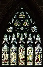The west end of the nave is dominated by an eight-light window in the Perpendicular Gothic style which almost fills the upper part of the west wall. It contains stained glass designed by W. T. Carter Shapland dating from 1961 and depicts the Holy Family in the middle two lights, flanked by the northern saints Werburgh, Oswald, Aidan, Chad and Wilfrid, and Queen Ethelfleda.[48]