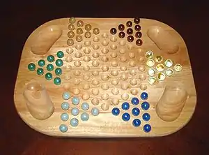 Sternhalma, commonly known as Chinese checkers (U.S. and Canadian spelling) or Chinese chequers (UK spelling),[1] is a strategy board game of German origin that can be played by two, three, four, or six people, playing individually or with partners.[2] The game is a modern and simplified variation of the game Halma.[3] "Complexity: requires no counting or spelling; even young children can play."[4]